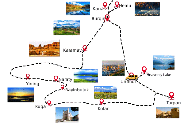 This is one of the best tour to drive along the famous Duku Highway which you can experience all the stunning scenery on the highway from the start point of it to the end. It will take you to visit the great grassland - Bayinbuluk, the maginificent scenery in the middle of Tianshan Mountain - Tianshan Grand Canyon. Experience Xinjiang folklore of Kuqa and explore the legends of Turpan!