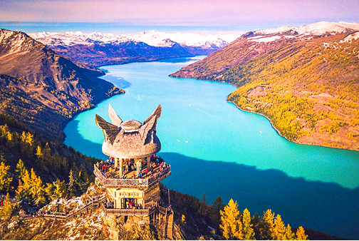 Enjoy the panoramic view of Kanas Lake at the Fish Pavilion and see the beautiful scenery in the distance.