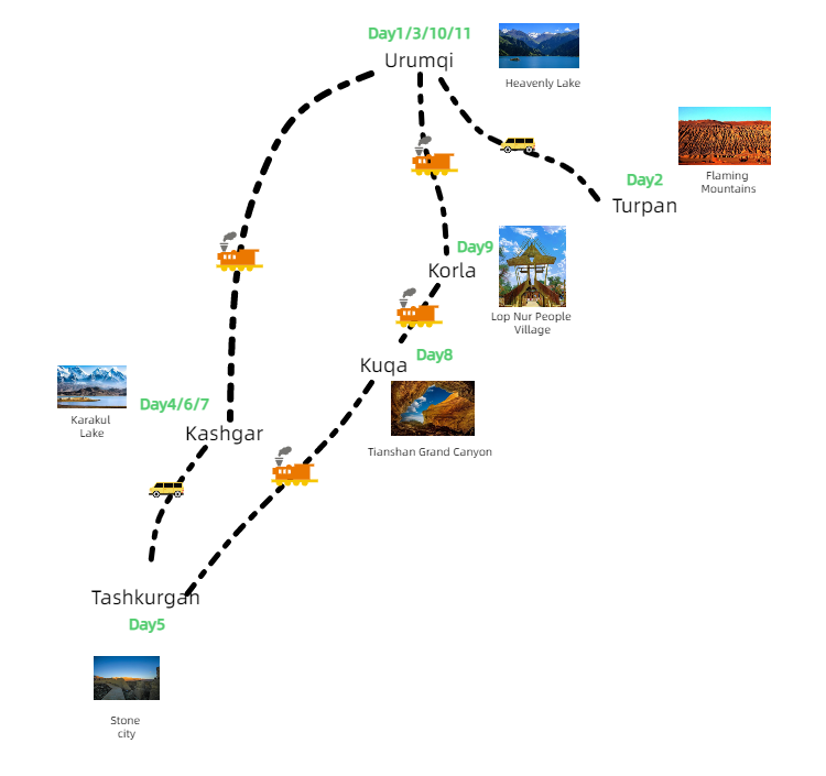 Tickets for all the attractions: Karez Well irrigation system, Flaming Mountains, Jiaohe Ruins, the Heavenly Lake+Interval Bus, Karakul Lake,Stone City,Id Kah Mosque,Abak Hoja Tomb, Tianshan Grand Canyon, Kizil Caves, Lop Nur People Village, and Xinjiang Ancient Ecological Park