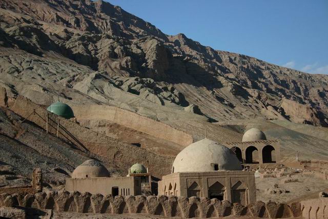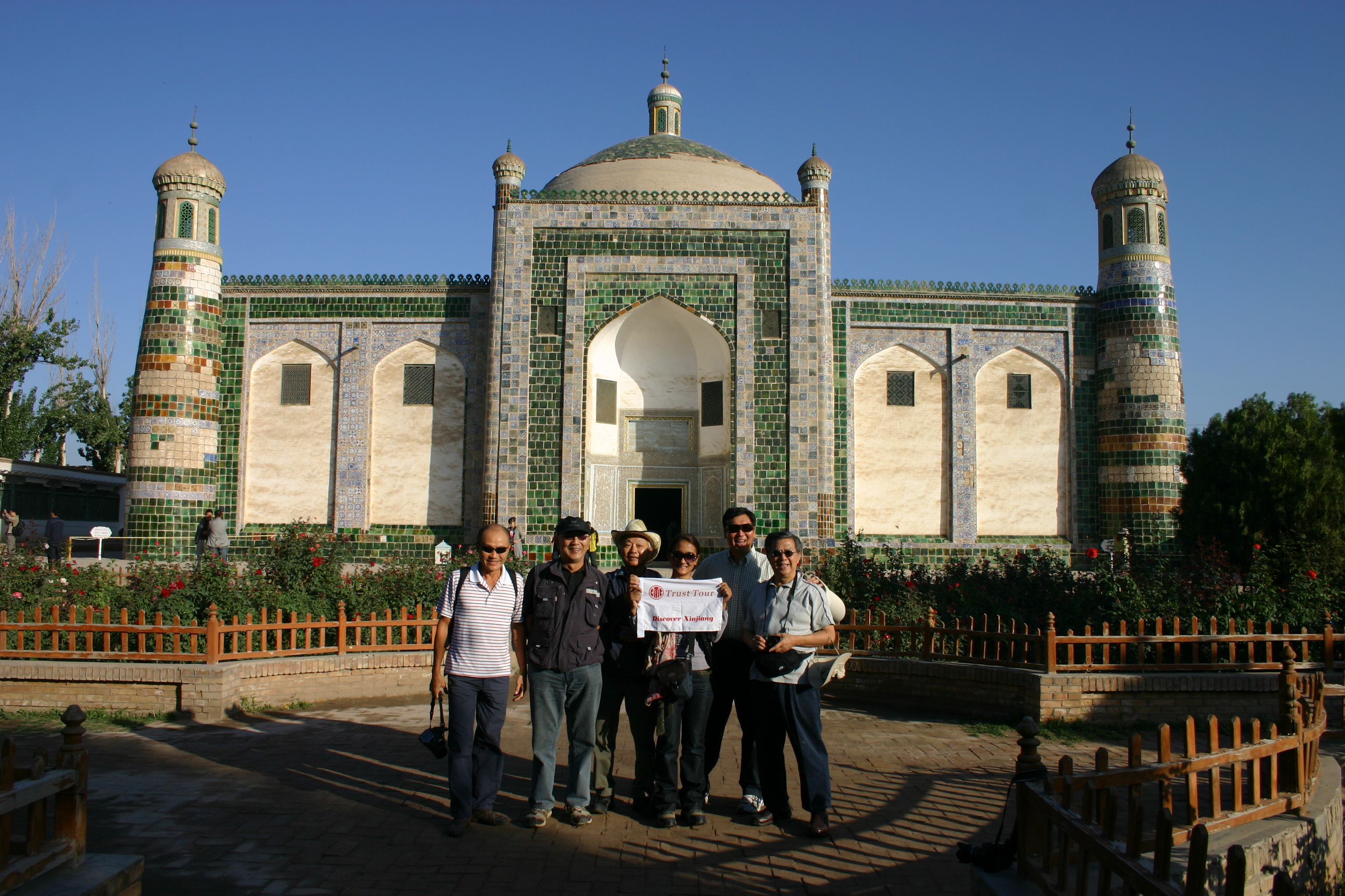 Apak Hoja Tomb This Mazar is the holiest place in Xinjiang and an architectural treasure Built in 1640, it is reminiscent of the Central Asian artistic style of Samarkand or Isfahan. A handsome blue-and-white tiled gate leads into the compound, which includes a small religious school and the Abakh Khoja family tomb. The latter is domed and faced with multi - colored tiles.