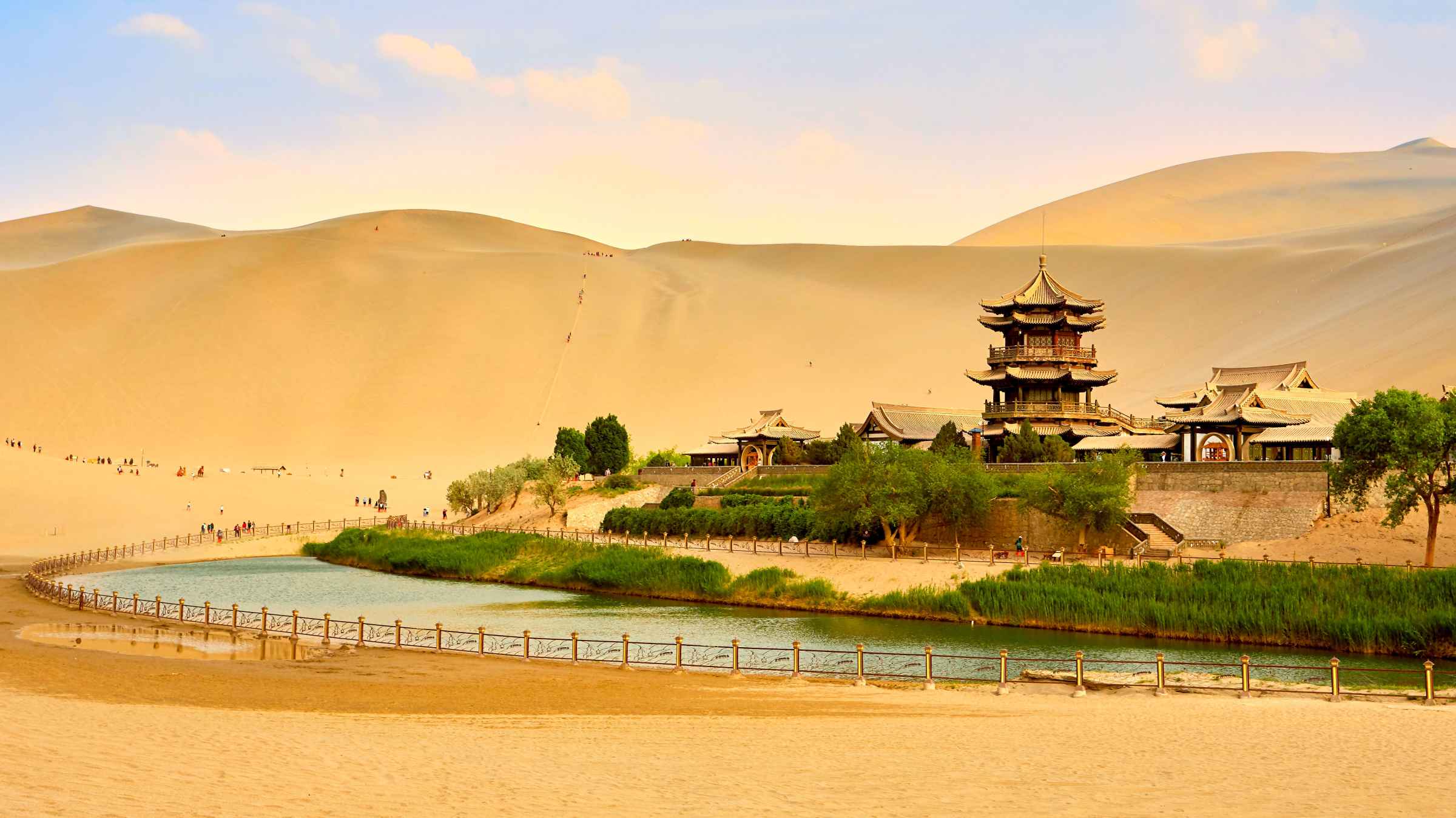 Our guide will meet you at your hotel lobby in the early morning, then drive to Mogao Grottoes , where you can enjoy the magnificent grottoes and mural art, and learn the history of Buddhism in Dunhuang through explanation and film display, which is the best option for tourists to visit Dunhuang. Afterwards, continue the tour to Echoing Sand Mountain & Crescent Lake. When there is wild wind, the sands will be blown up and make a loud sound, while the sound sounds like being produced by some ancient musical instrument when blown by the breeze. There is also a Crescent Lake that has been in existence for hundreds of years without ever being buried by the sand.