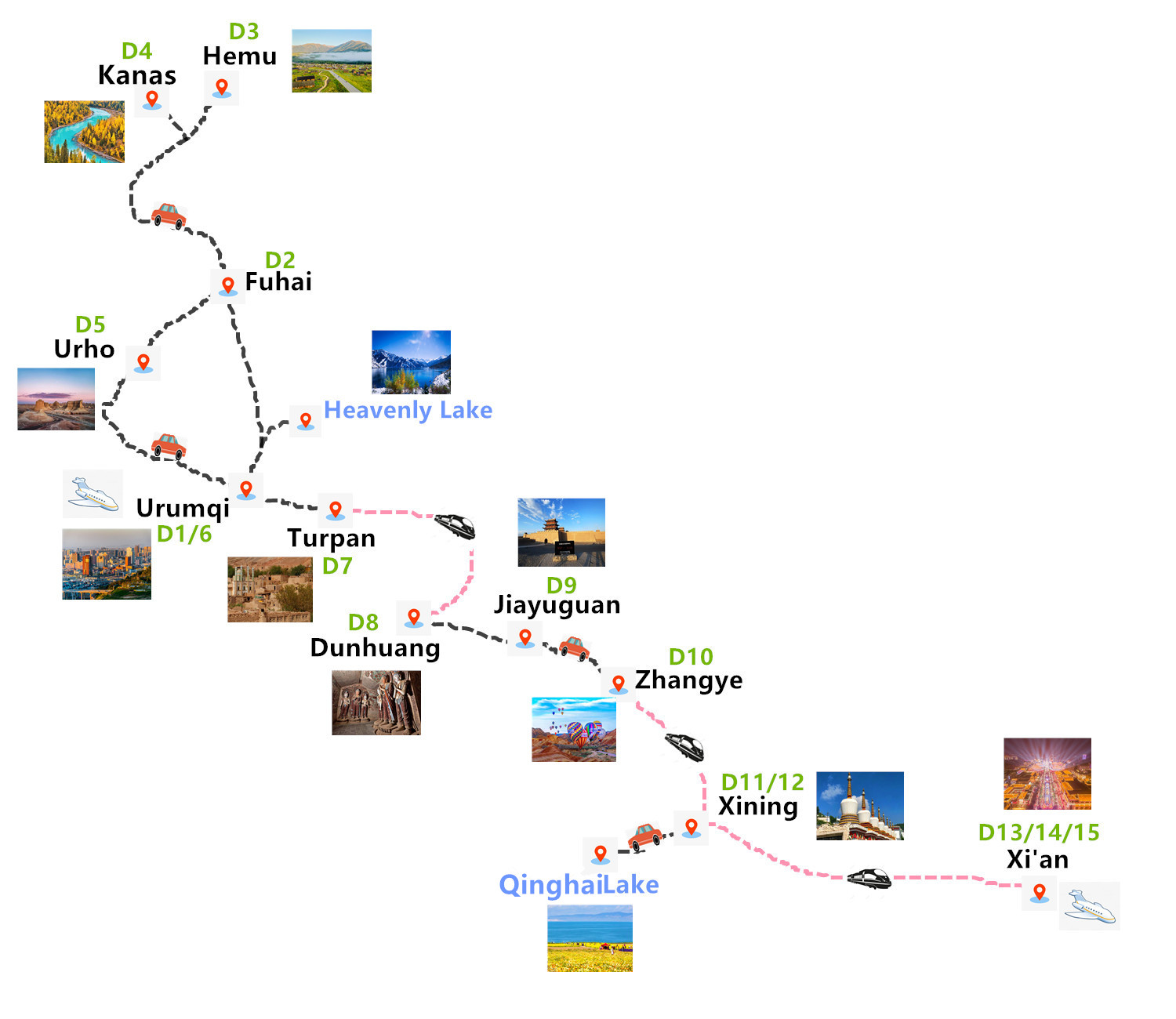 Ranging from the picturesque Heavenly Lake, tranquil Tuwa Hemu village, amazing Kanas Nature Reserve, the oldest Uygur Tuyoq Village to the cultural treasure Mogao Grottoes, splendid Zhangye Danxia National Geological Park and the most imposing historic site Terracotta Warriors. This 15 Days North Xinjiang and Silk Road Adventure will take you to follow the ancient footprints on Silk Road, go back to history and get in touch with different cultural relics as well as enjoy the most outstanding natural beauty on the way.