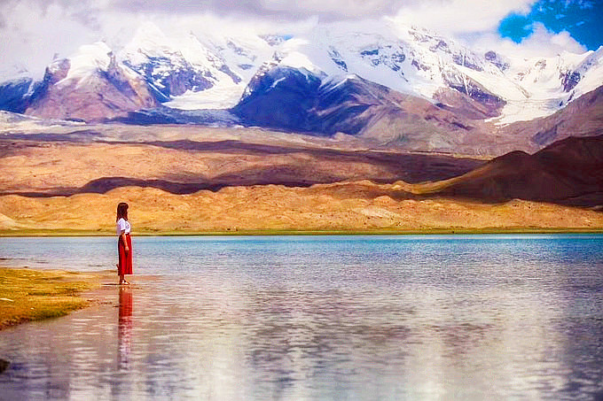Next we will stop at Karakul Lake, where herds of livestock are reflected as Kirghiz herdsmen usually settle down and graze their herds by the lake.