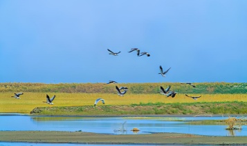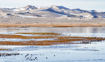 1, there is a nice lake at the south of the Qimantag County, at dawn of the autumn, a large number of birds on the lake fly.