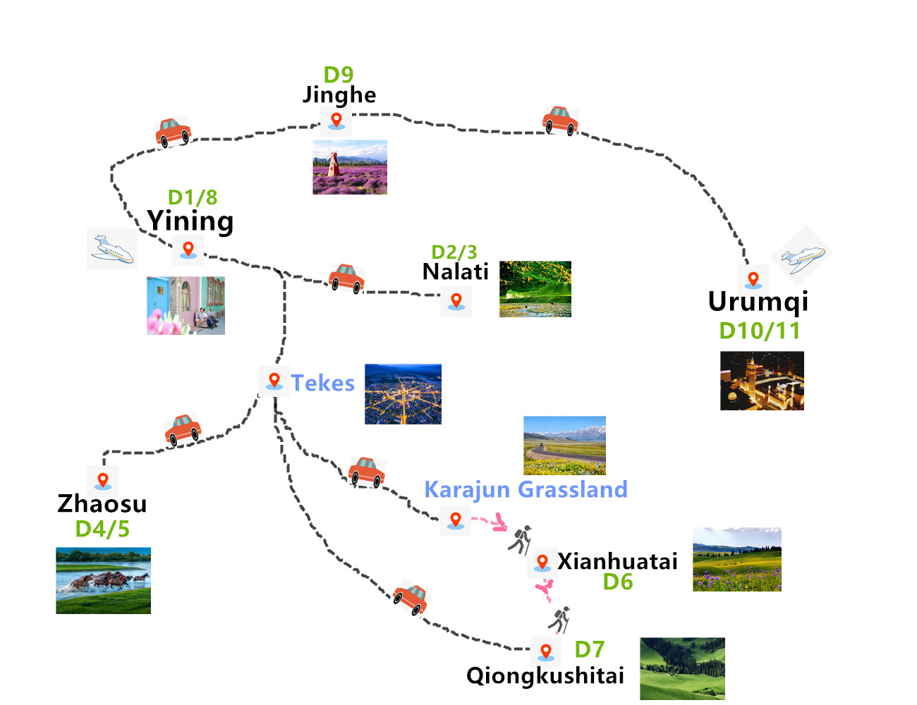 When you are planning a tour in Xinjiang, it's a great idea to combine both its historical destinations and spectacular scenic destinations. This is a trip strongly suggested for you on which you will discover cultural destinations in Xinjiang, including Kazanqi Folk Village, Xinjiang Grand bazaar, Liuxing Street, then enjoy two attracting hiking destinations - Xianhuatai and Qiongkushitai. All attractions and activities are well organized to a leisure pace in this 11Days trip!