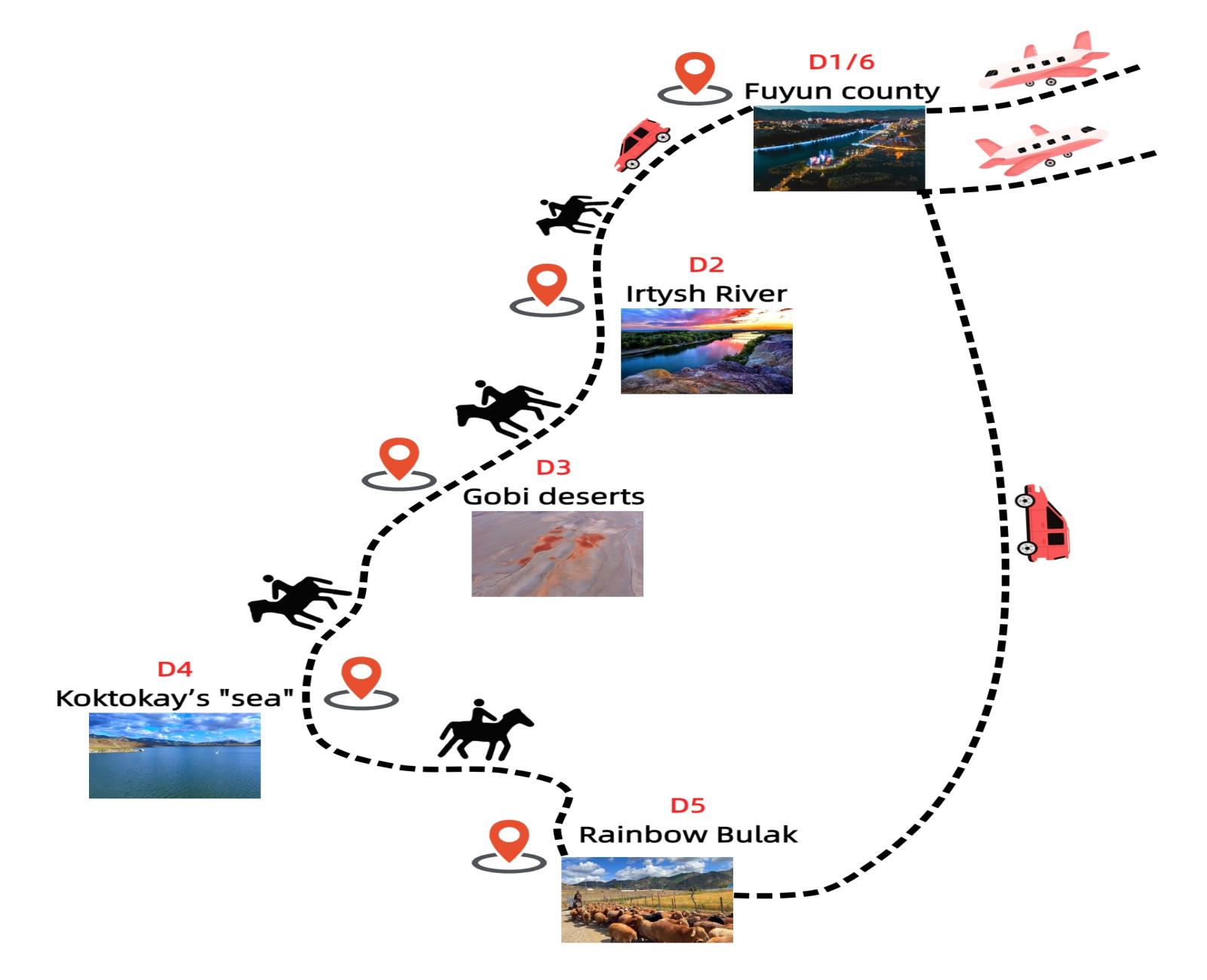 Explore Altay's diverse landscapes—lush valleys, vast deserts, Koktokay's mystical "sea", and sunflower fields—with unique daily riding themes for an ever-changing visual experience.