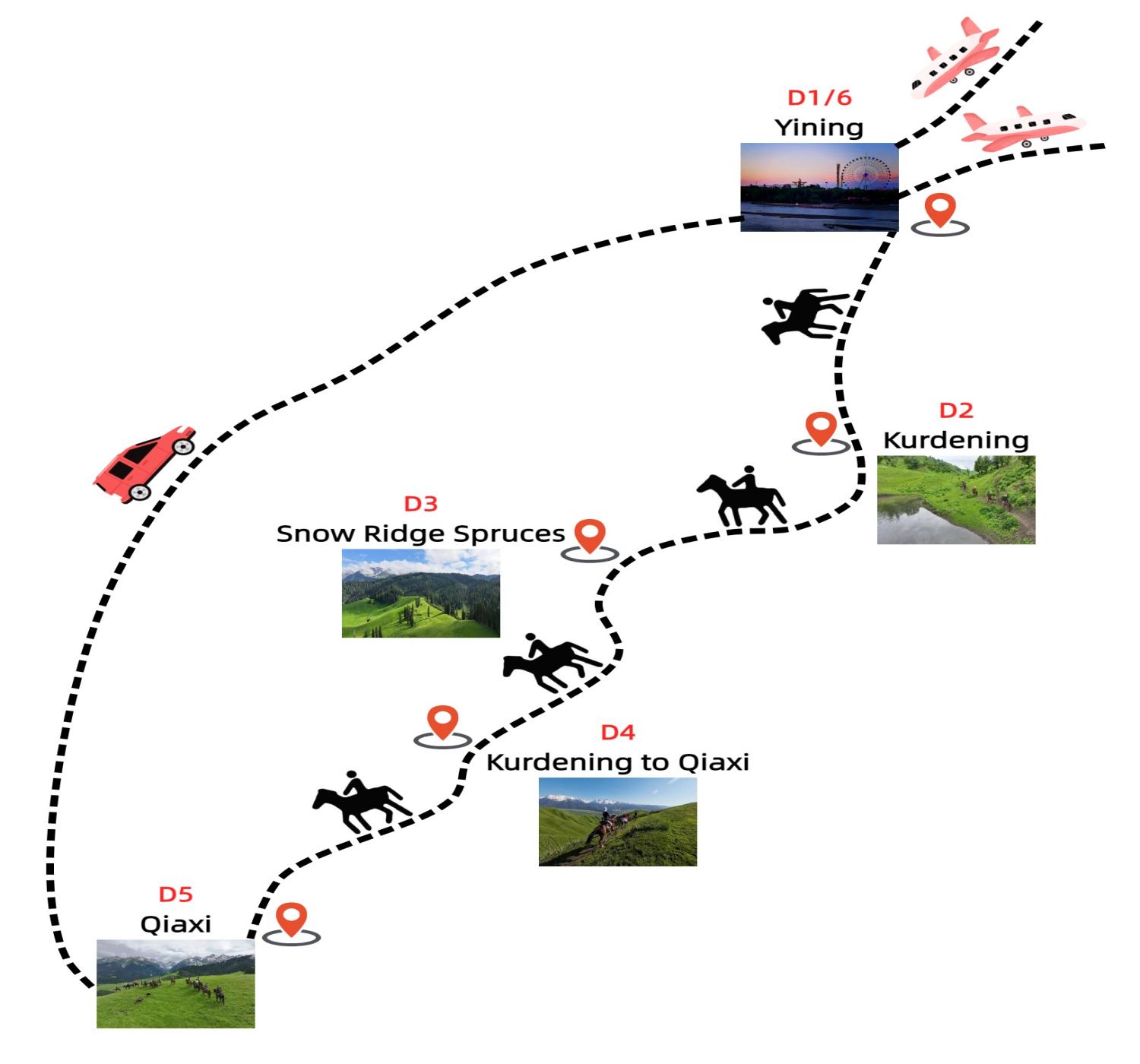 Embark on a 6-day horseback riding tour in Kuerdening and Qiaxi, Xinjiang. Ride through forests, valleys, and grasslands, galloping across stunning landscapes. Explore the Snow Ridge Spruce forests, camp with a local herder's family, and savor homemade lamb skewers. Traverse Qiaxi's snow-capped mountains and lush terrains, capturing breathtaking views. Conclude with a full day in Qiaxi before departing from Yining, leaving with unforgettable memories.