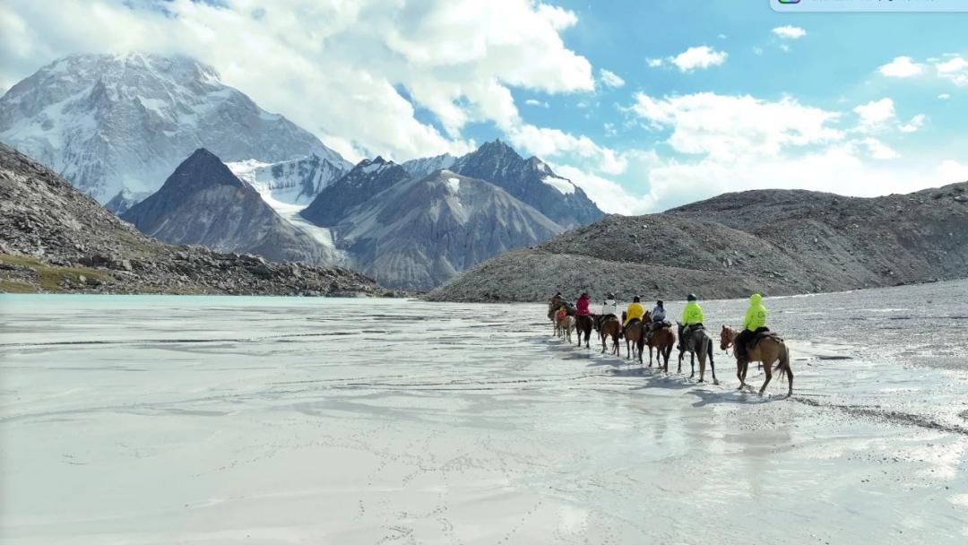 A visually stunning 20km horseback ride! Wind past the jewel-like Green Lake and magnificent glacial waterfalls before crossing the Hadamuzi Pass. In the afternoon, you have the choice to explore the icy wonders of the Muzart Glacier, its crystal rivers and jagged ice formations offering endless photo opportunities.