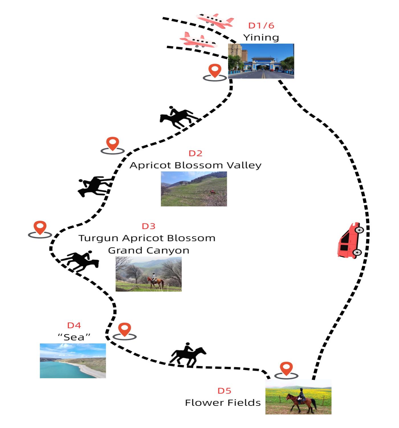 The Yili Apricot Blossom Sea Riding Route is a unique 4-day combo: 2 days for apricot blossoms and 2 days for sea riding, the only one of its kind in the industry.