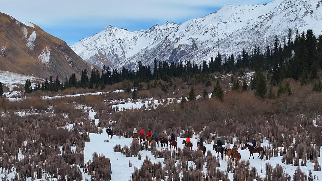 Wake up to a thrilling day in the Tianshan Canyon. Sheltered from the cold, this valley basks in mild temperatures (3-5°C)—perfect for riding. Mount your horse under the morning sun and explore dramatic landscapes: snowfields, pine forests, and jagged peaks that pierce the sky. At midday, gallop across an open plateau flanked by mountains, feeling like the hero of your own epic tale.