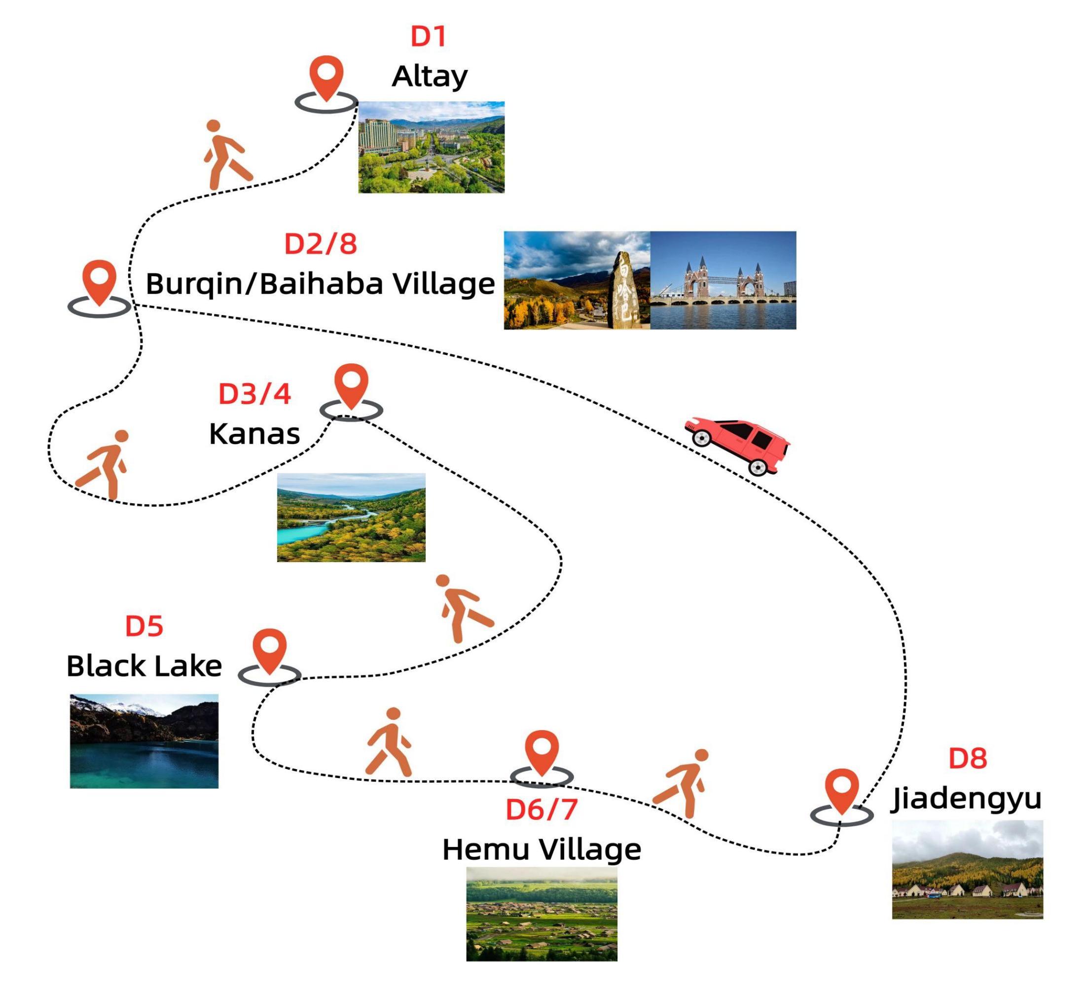 The 8-day Kanas Trekking Adventure takes you from Altay to Hemu Village, where you'll trek 18km to Kanas, exploring its scenic spots like Kanas Lake and Immortal Bay. Next, a 20km trek leads to Black Lake for a night under the stars, followed by a 22km to Hemu through golden birch forests. After a 12km trek to Halfway Inn, the journey concludes with a trek to Jiadengyu and a drive to Burqin, offering a blend of cultural immersion and stunning natural beauty.