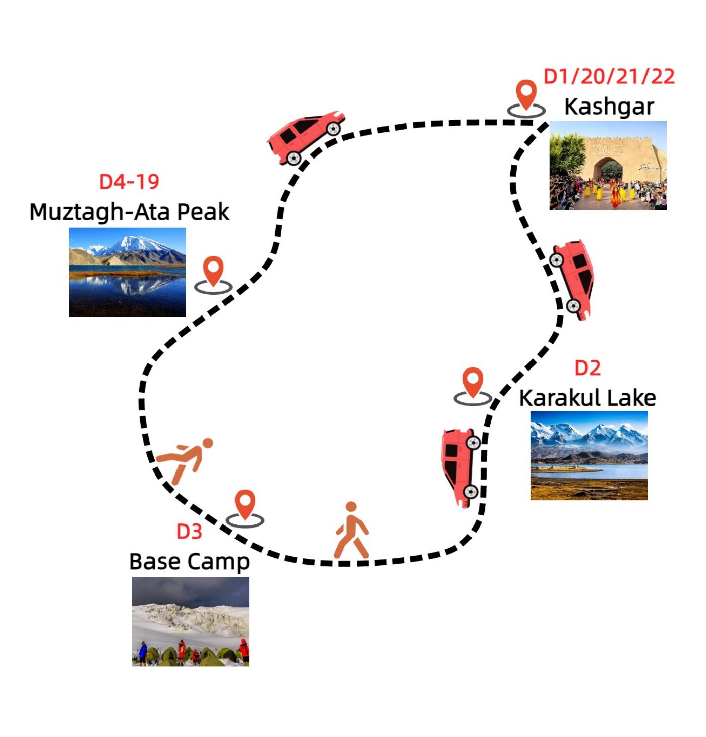 Embark on a 22-day adventure to conquer the majestic Muztagh-Ata Peak, starting in the vibrant city of Kashgar. Journey along the stunning Karakoram Highway, trek through alpine meadows, and acclimatize at high-altitude camps before your summit push. After your triumph, return to Kashgar to explore its rich culture, bustling bazaars, and ancient streets. This expedition blends thrilling mountain challenges with unforgettable cultural immersion, all supported by expert logistics for a seamless experience.