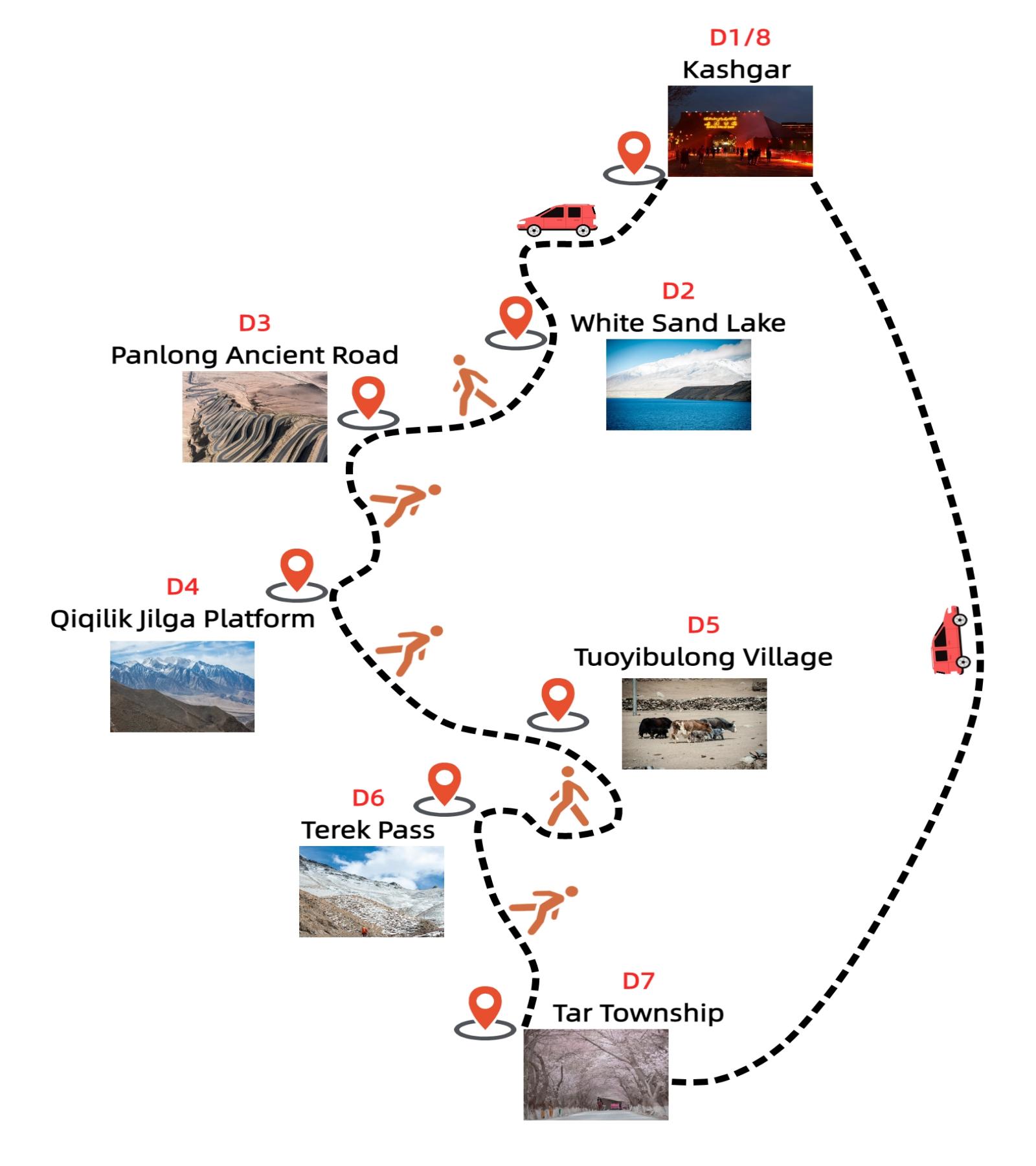 The trek starts in Kashgar, passing Tashkurgan, Panlong Ancient Road, ending in Yingjisha. Highlights include White Sand Lake, Karakul Lake, and Muztagh Ata Peak, offering stunning high-altitude scenery.