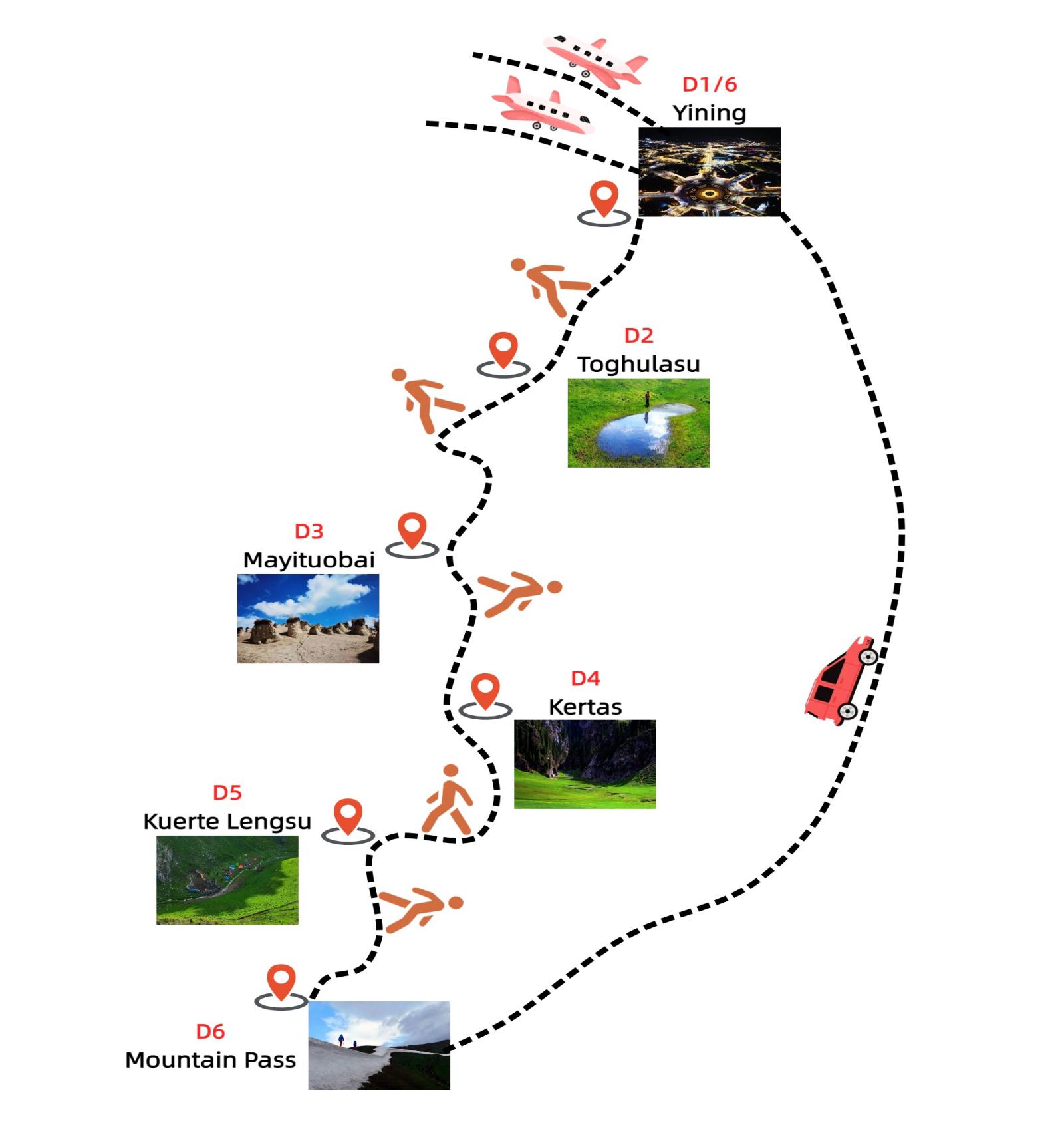 Embark on a 6-day trekking adventure through the stunning landscapes of Xinjiang. Begin with an easy trek near the Toghulasu Scenic Area, followed by challenging ascents and river crossings as you explore Mayituobai, Dakertas, and Kuerte Lengsu. Traverse lush valleys, expansive grasslands, and high mountain passes, culminating in a breathtaking panoramic view of Sayram Lake and Guozigou from a 2760-meter pass. Each day offers a mix of adventure and tranquility, with nights spent camping under the stars.